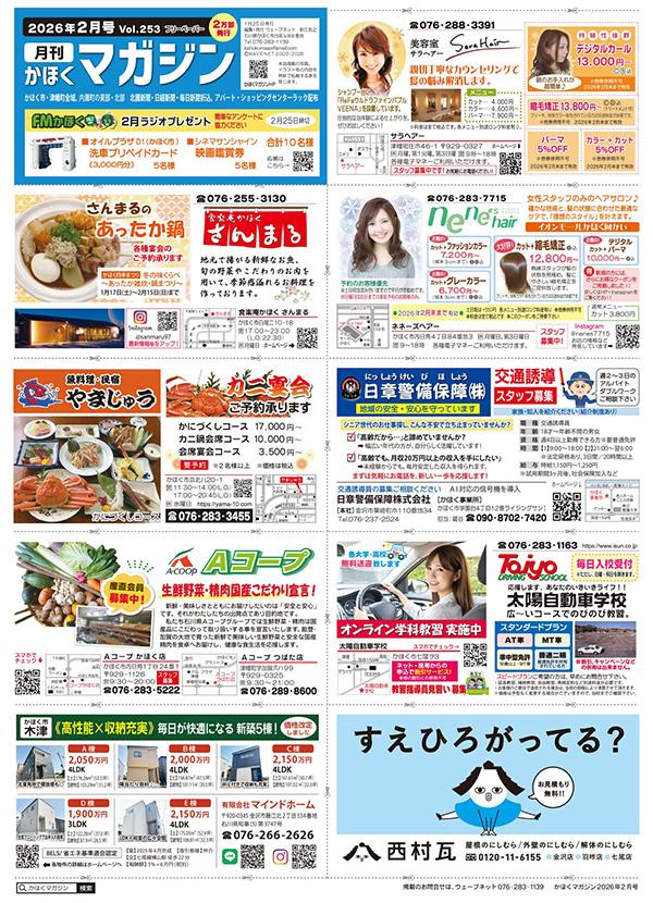 Aコープ、オイルプラザD1、サラヘアー、食楽庵かほく さんまる、太陽自動車学校、日章警備保障株式会社、nene’s hair、マインドホーム、西村瓦、魚料理・民宿やまじゅう