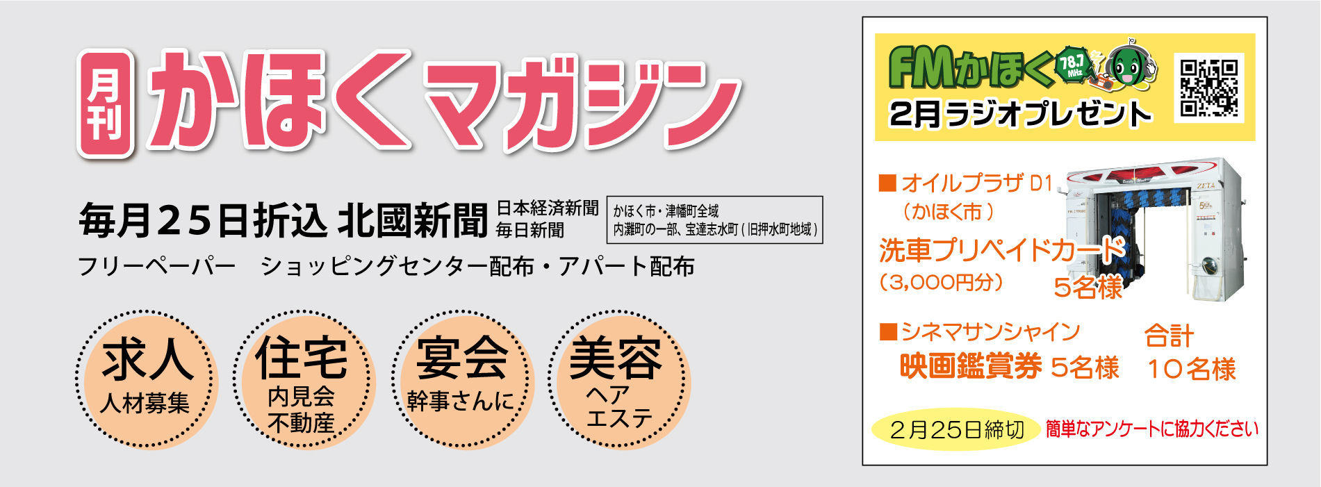 月刊かほくマガジンに広告掲載を希望されるお店・会社は、月刊かほくマガジン広告掲載規定をご確認後、下記のフォームにて、お申込、お問合せください。